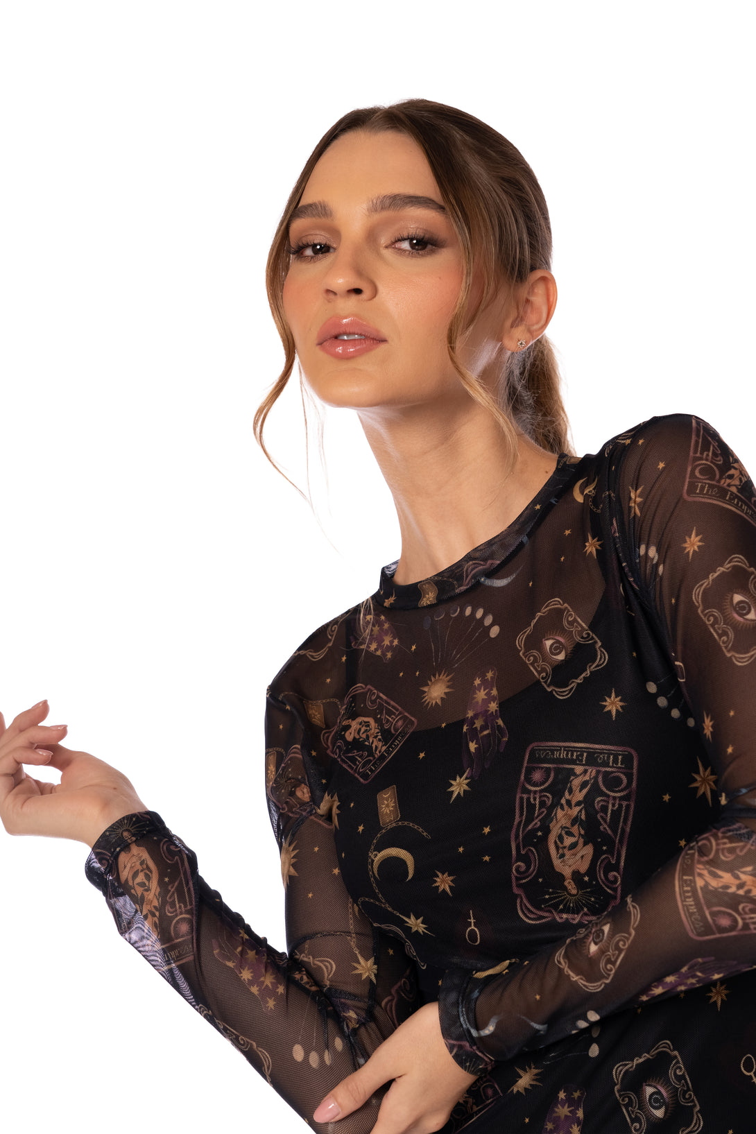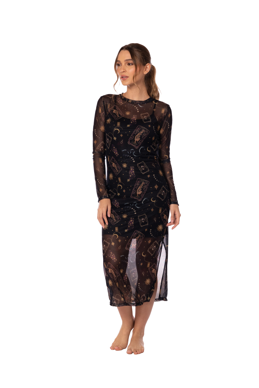 Vestido largo en malla con mangas largas, estampado exclusivo y vestido interno para mayor cobertura y comodidad.