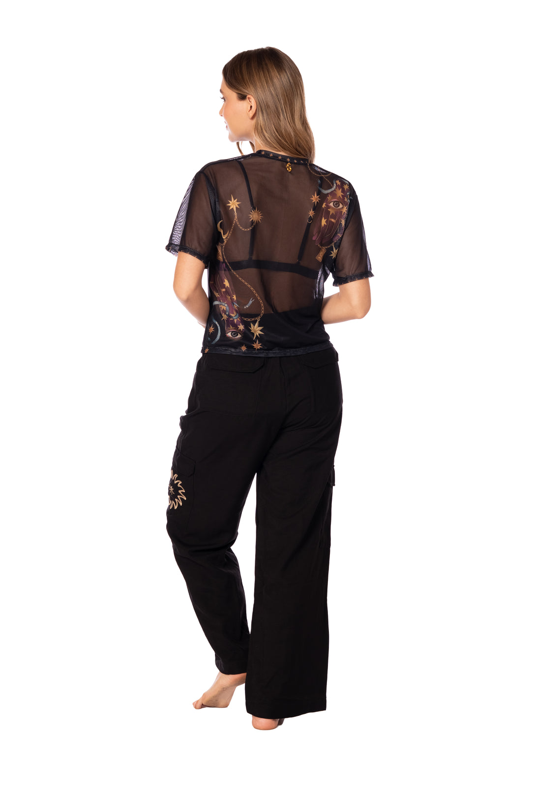 BLUSA MANGA CORTA EN MESH (malla transparente) con nuestro estampado EMPERATRIZ Lleno de amuletos, buena vibra, magia y color para tu día a día.. puedes combinarlo con nuestros vestido de baño para crear un outfit único y muy cool. La tela es super cómoda y fluida.