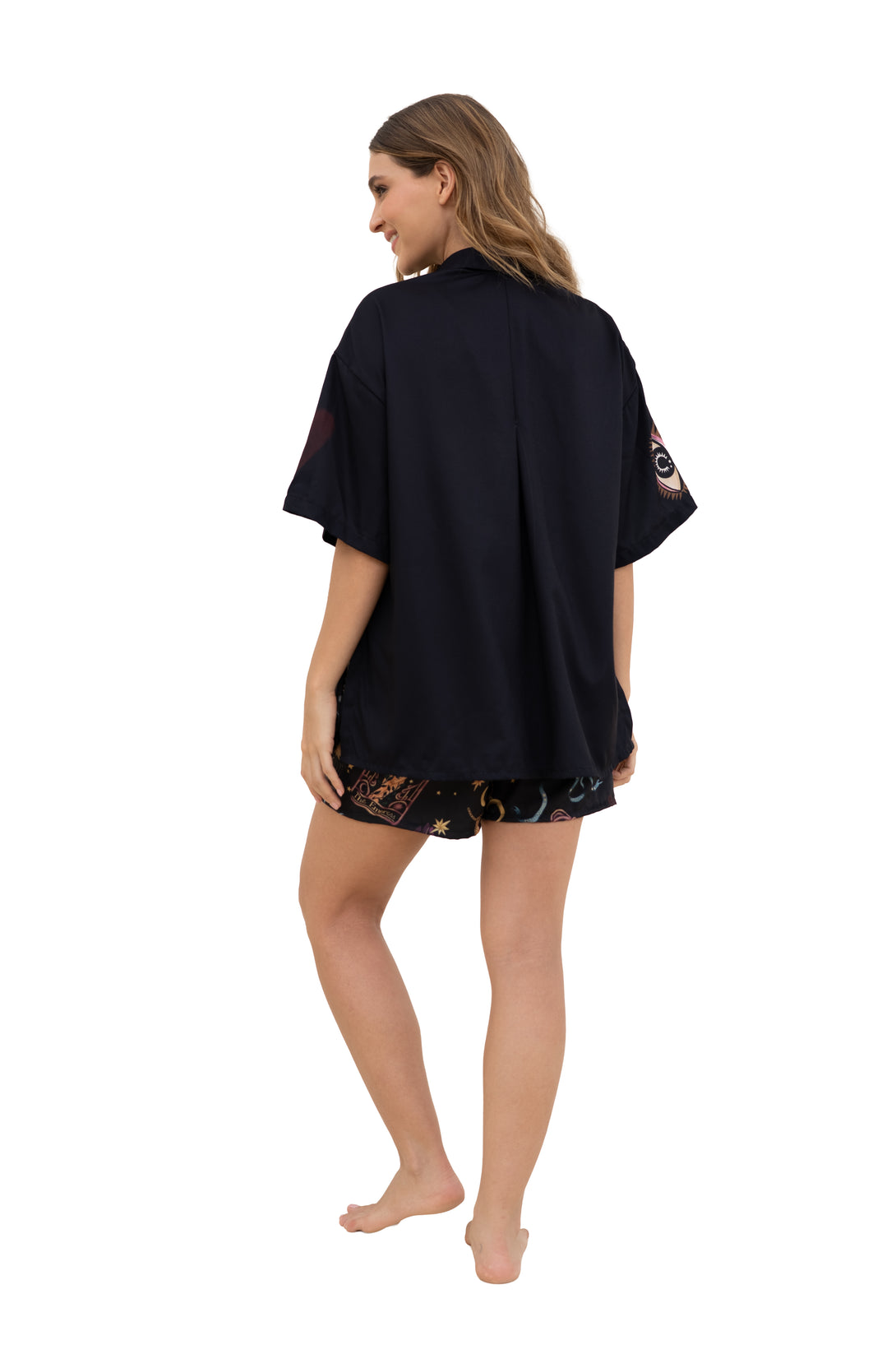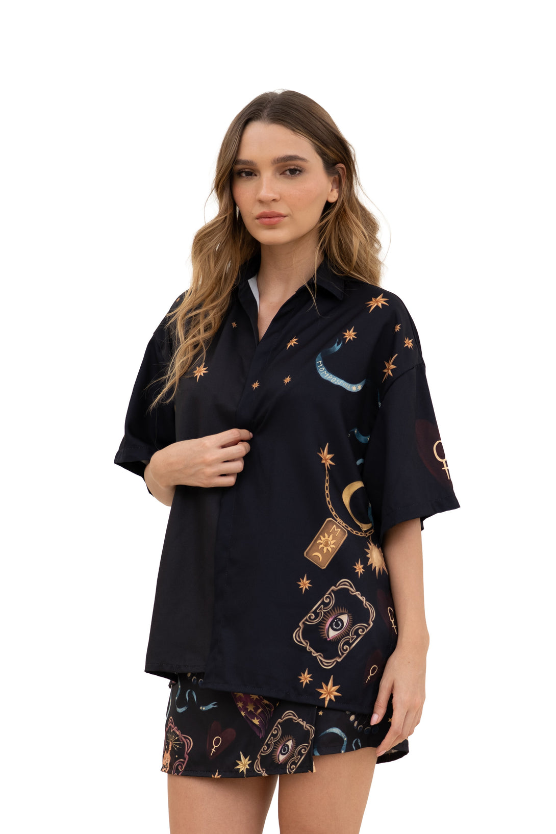 Camisa oversized estampada. Manga corta. Con cuello y botones.