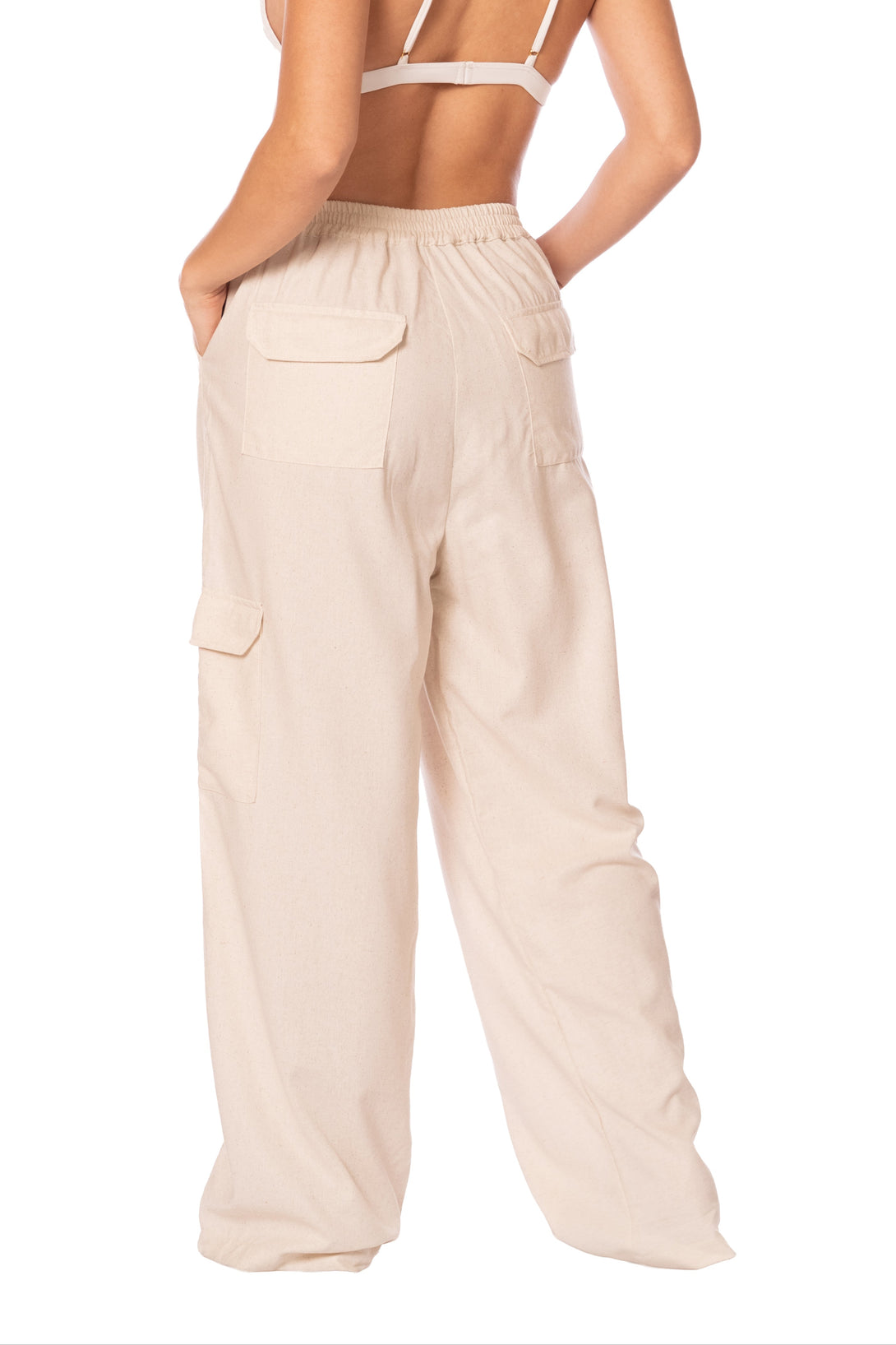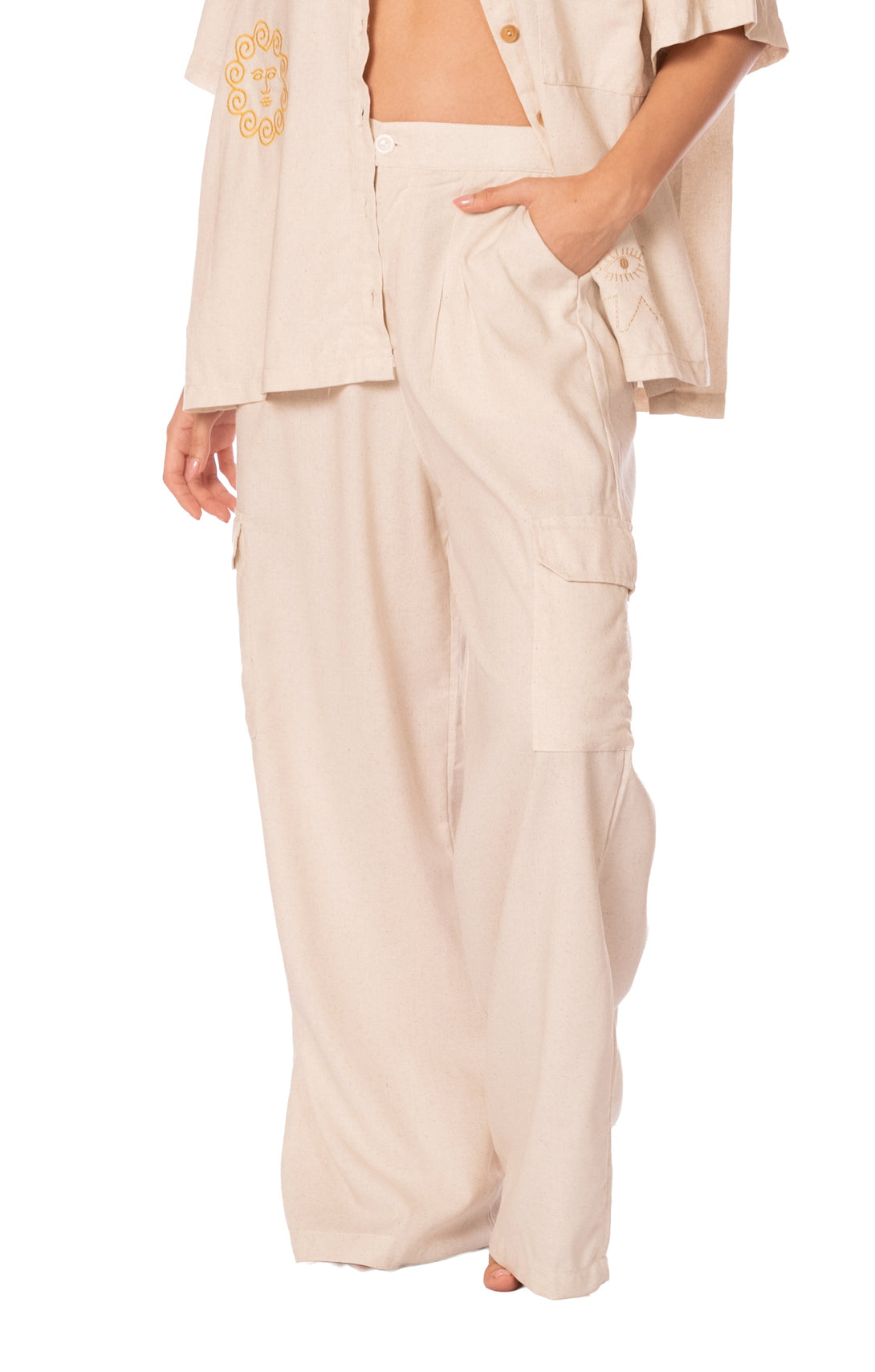 Pantalón cargo, tiro alto, cinturilla elástica y cierre de cremallera y botón. Con detalle en uno de sus bolsillos de un sol bordado.