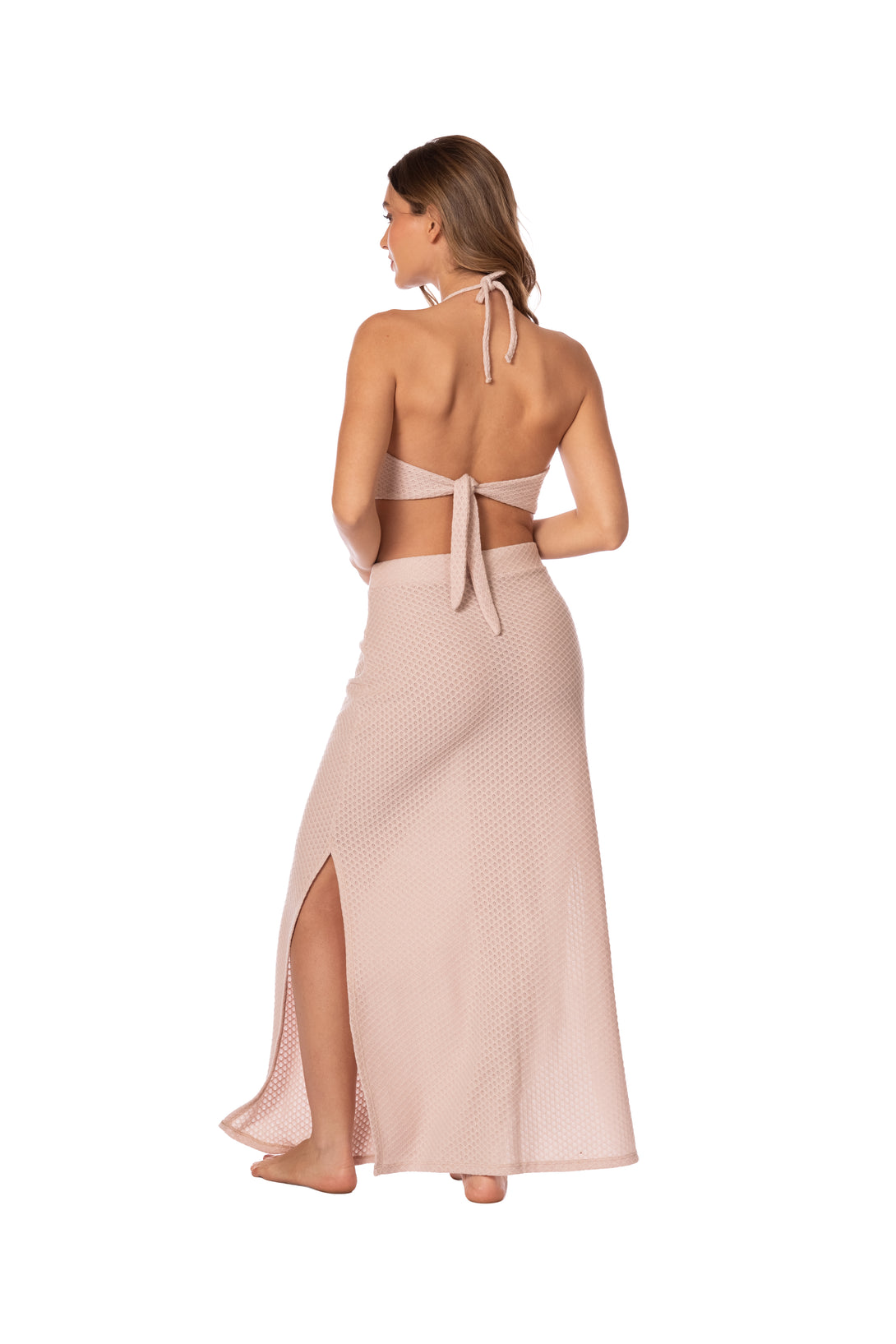 Falda larga confeccionada en tejido suave de macramé, de corte ajustado y cintura alta con elástico para un mejor ajuste. Presenta una abertura lateral en el dobladillo y forro interior para mayor comodidad.