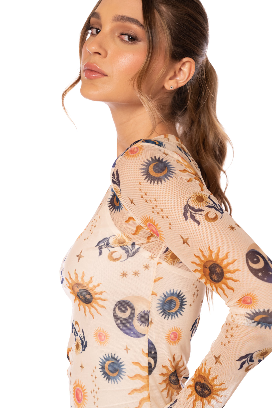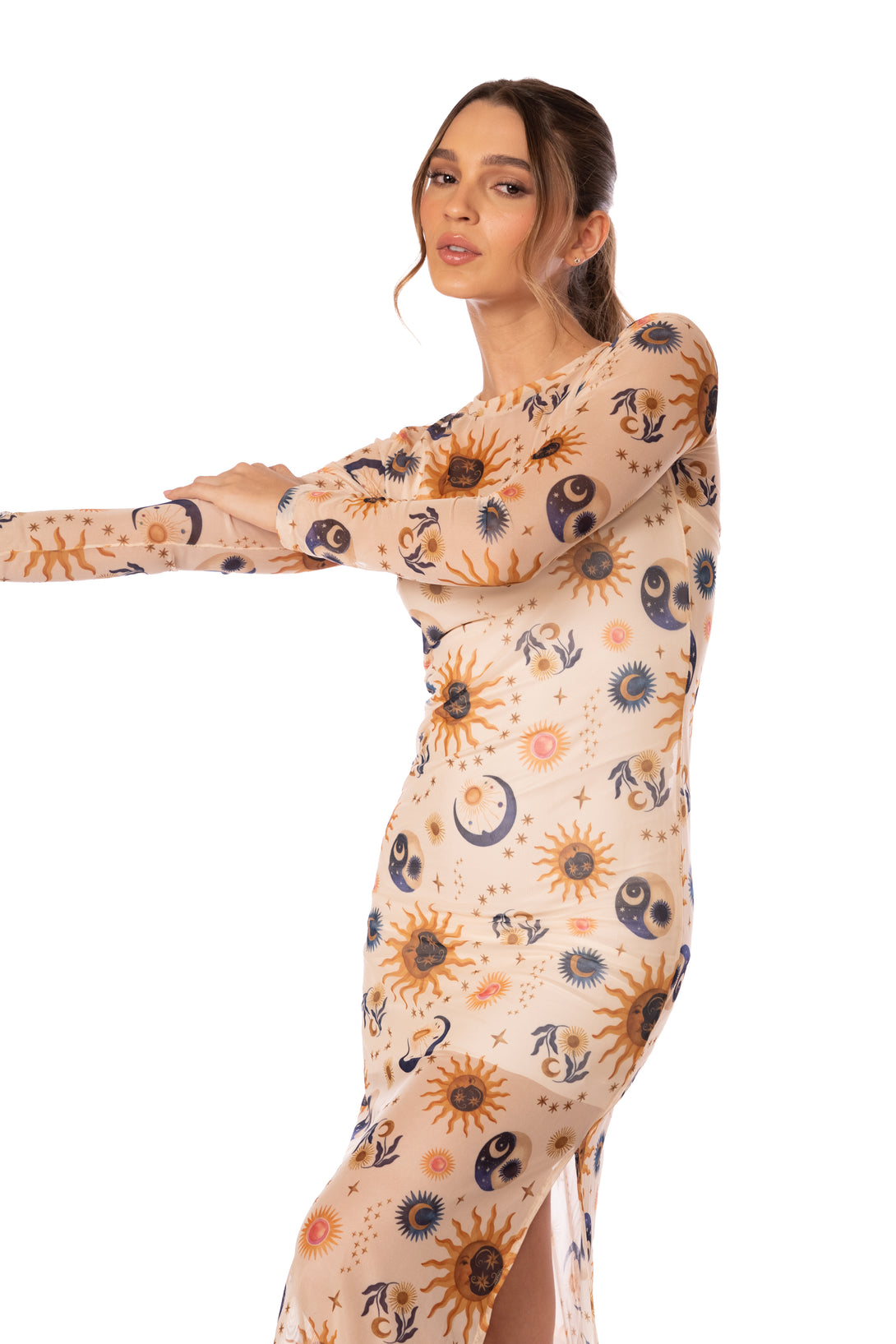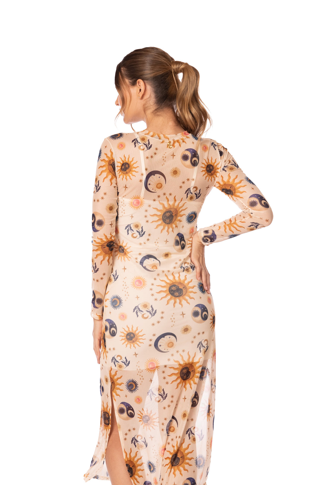 Vestido largo en malla con mangas largas, estampado exclusivo y vestido interno para mayor cobertura y comodidad.