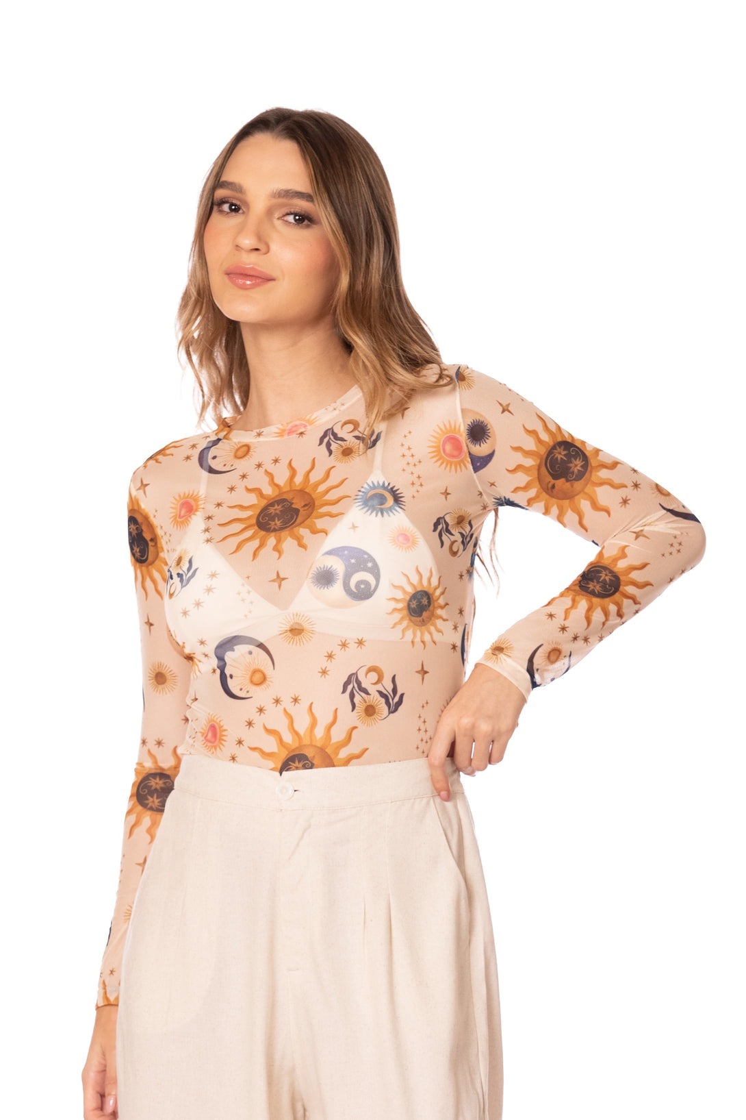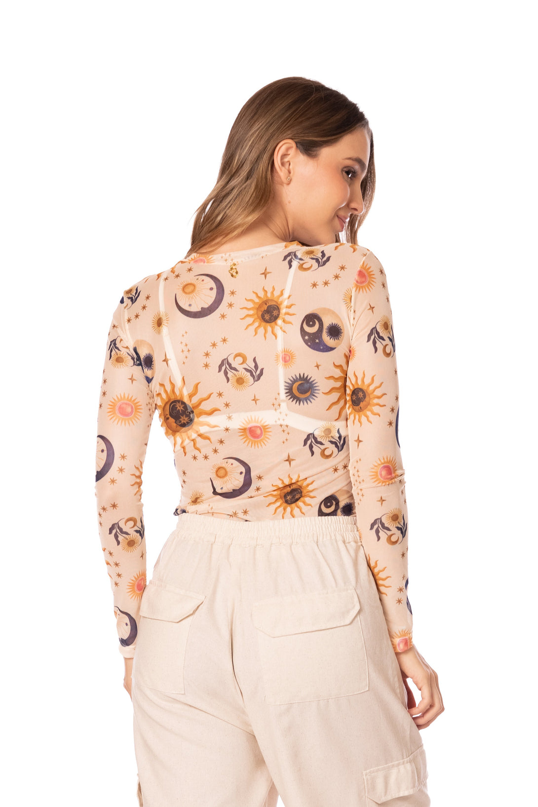 Blusa manga larga en Mesh (malla transparente) con nuestro estampado SOL Y LUNA lleno de amuletos, buena vibra, magia y versatilidad para tu día a día.. puedes combinarlo con nuestros vestido de baño para crear un outfit único y muy cool. La tela es super cómoda y fluida.