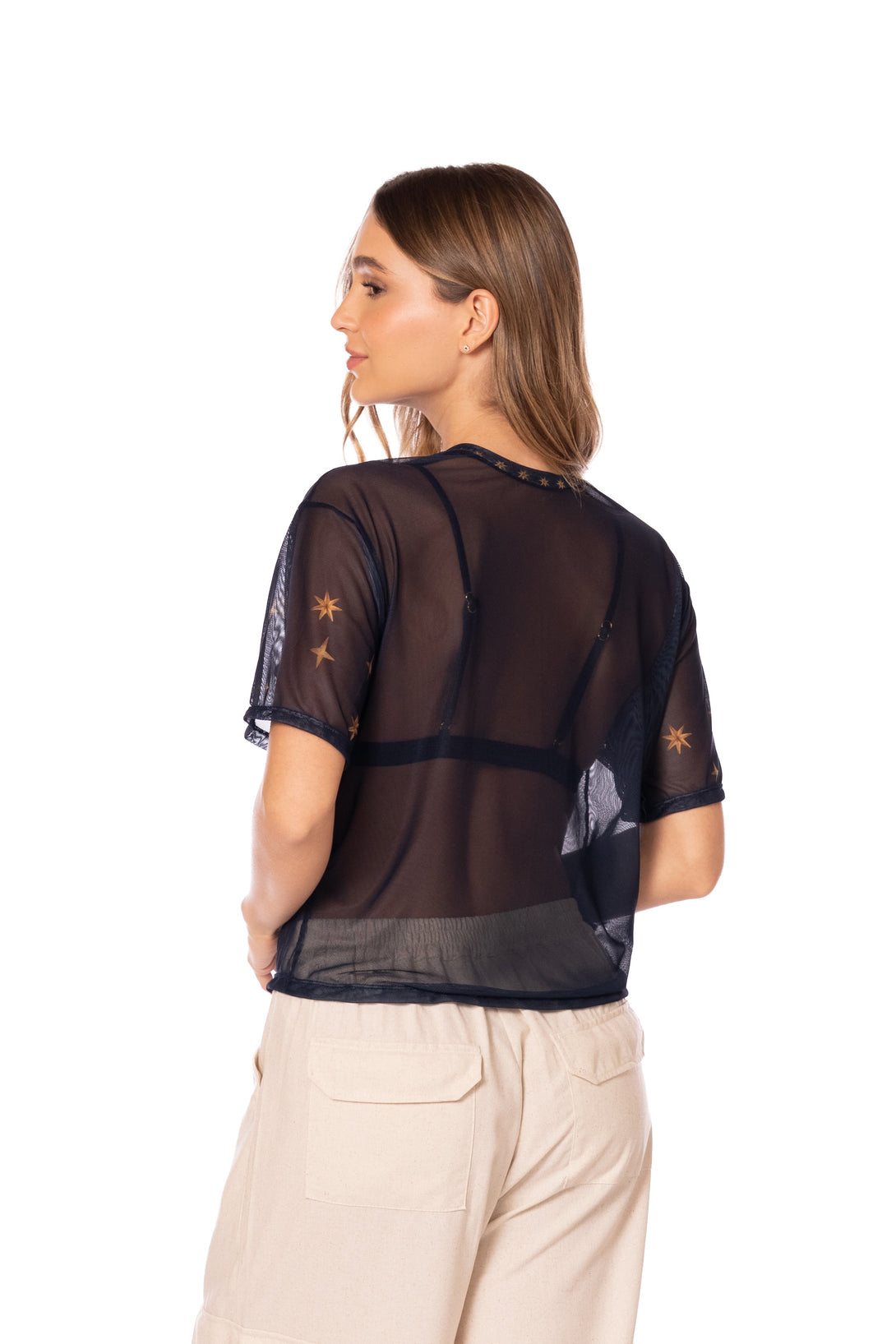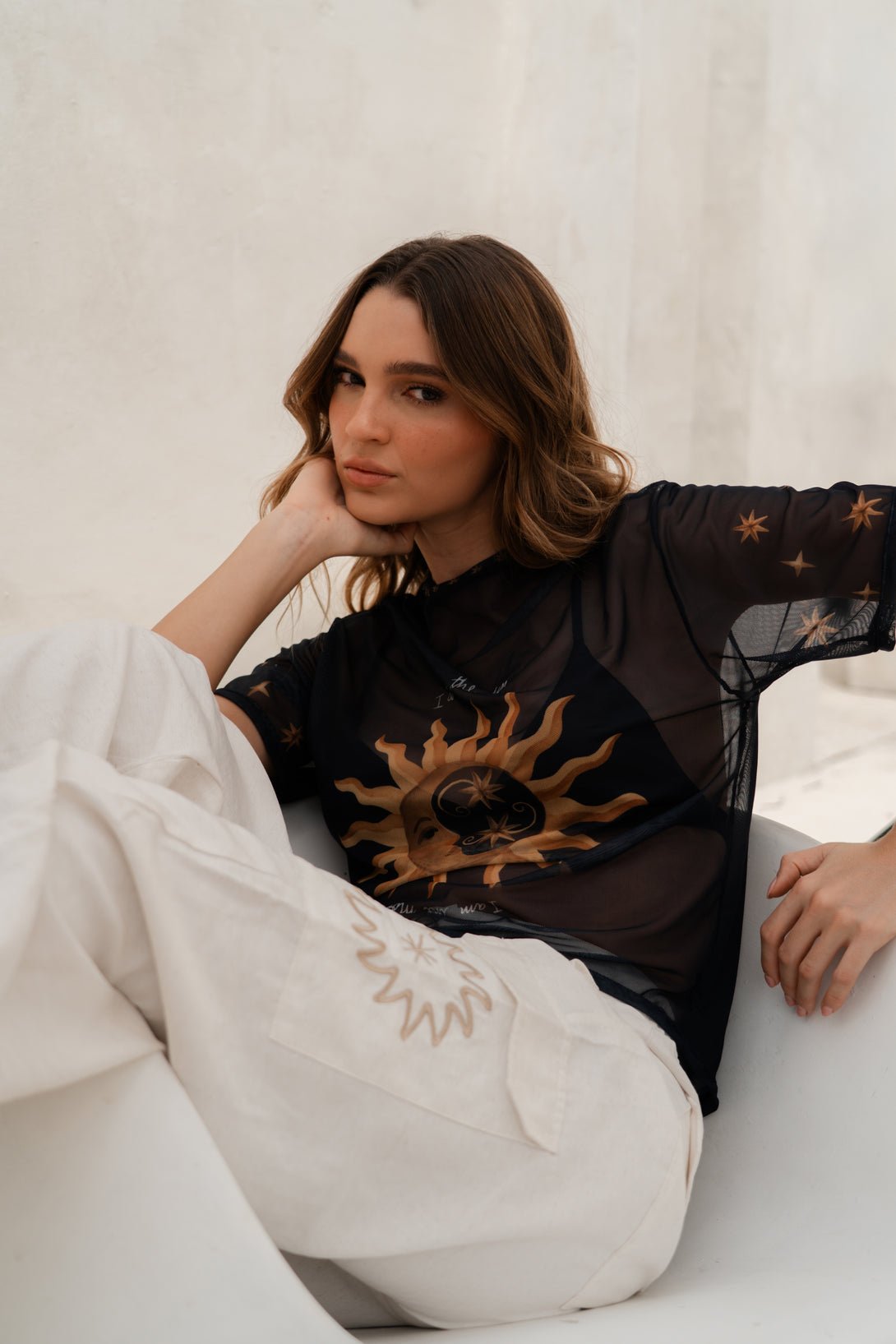 BLUSA MANGA LARGA EN MESH (malla transparente) con nuestro estampado SOL Y LUNA Lleno de amuletos, buena vibra, magia y color para tu día a día.. puedes combinarlo con nuestros vestido de baño para crear un outfit único y muy cool. La tela es super cómoda y fluida.