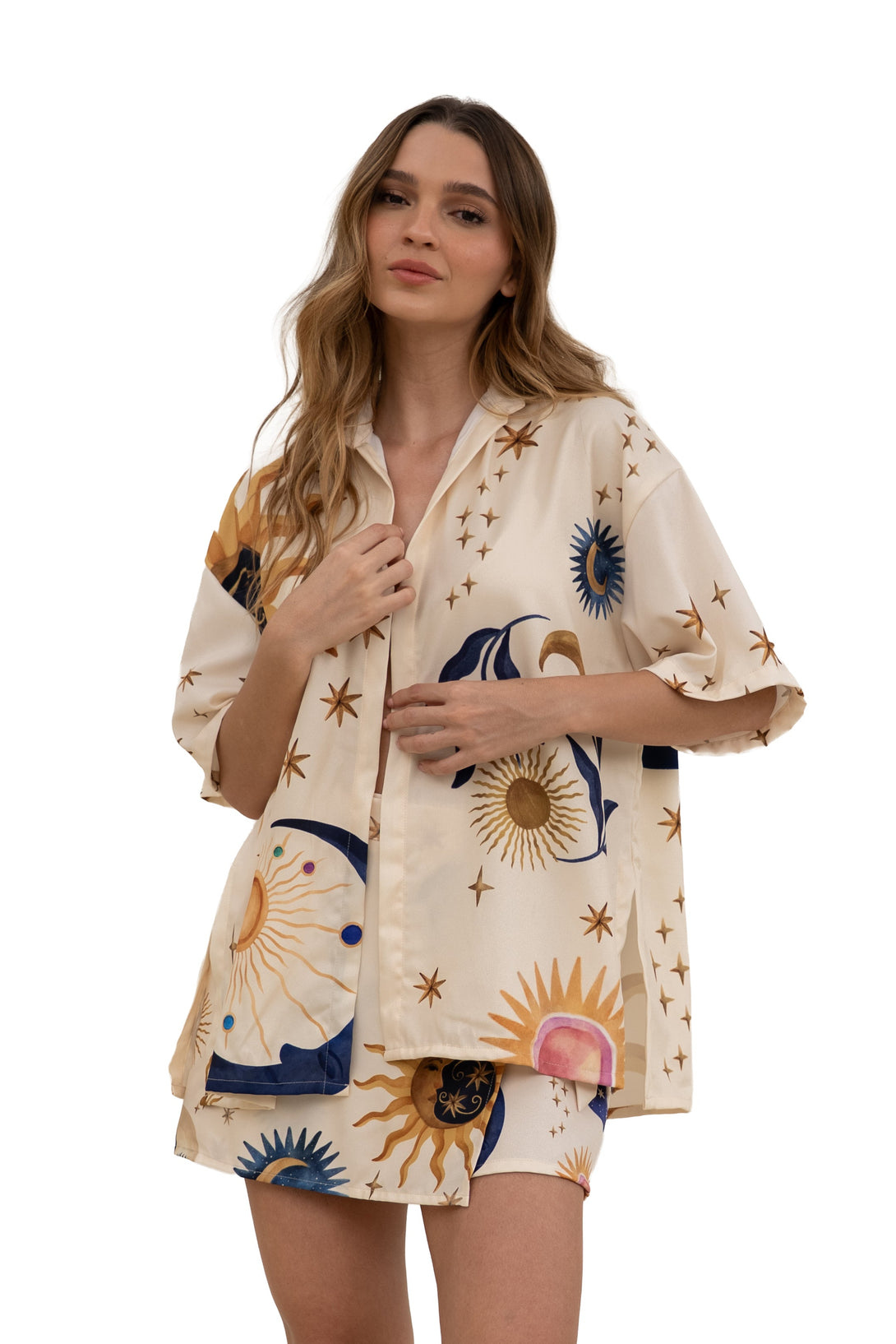 Falda short estampada, cintura alta, parte delantera cruzada con detalle de amarre y fruncido en la espalda.